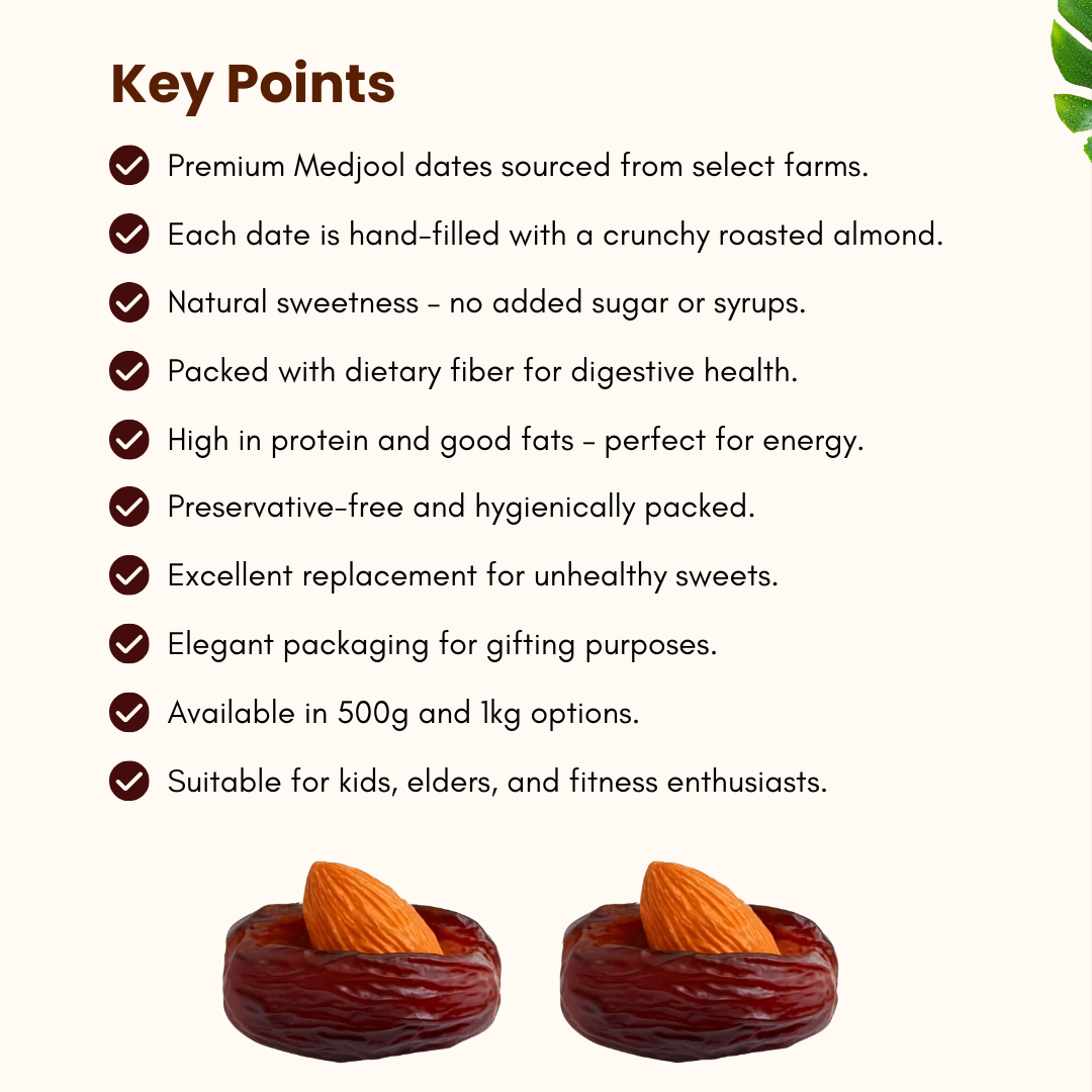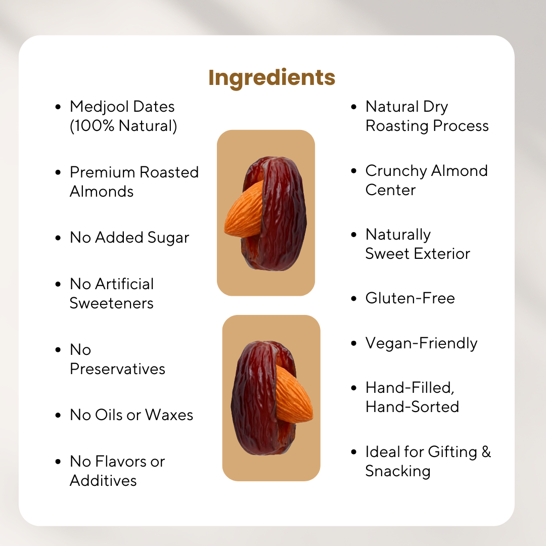 Delight in the luscious sweetness of premium Medjool dates perfectly paired with crunchy roasted almonds. This irresistible blend offers a satisfying mix of soft and crisp textures, making it a perfect choice for nutritious snacking, festive moments, or sophisticated gifting.