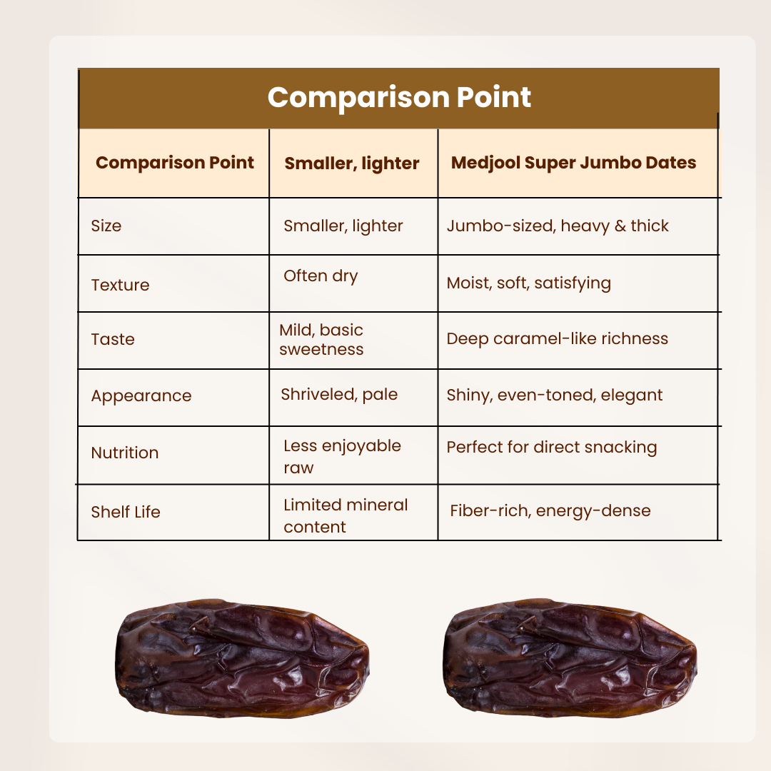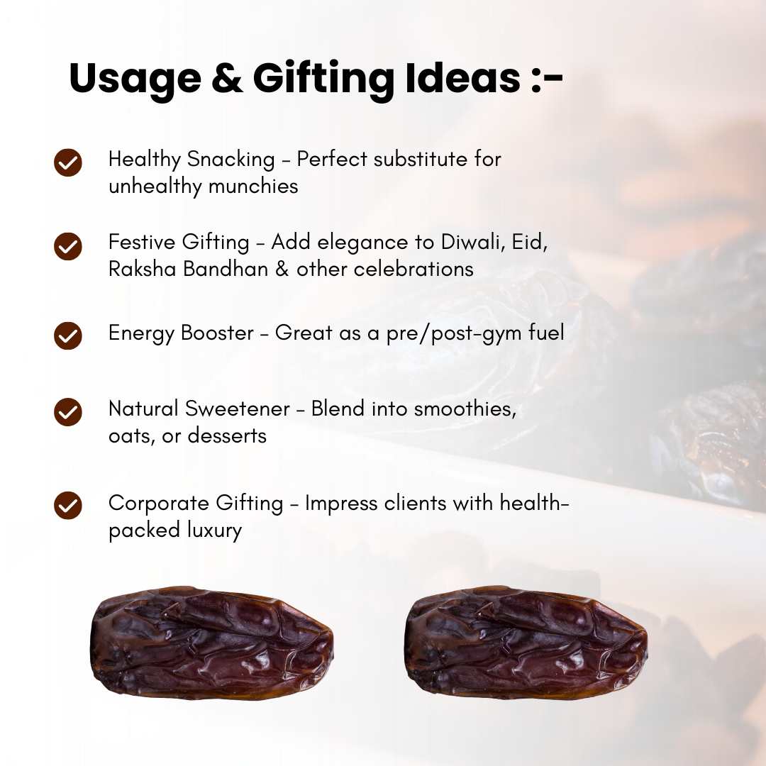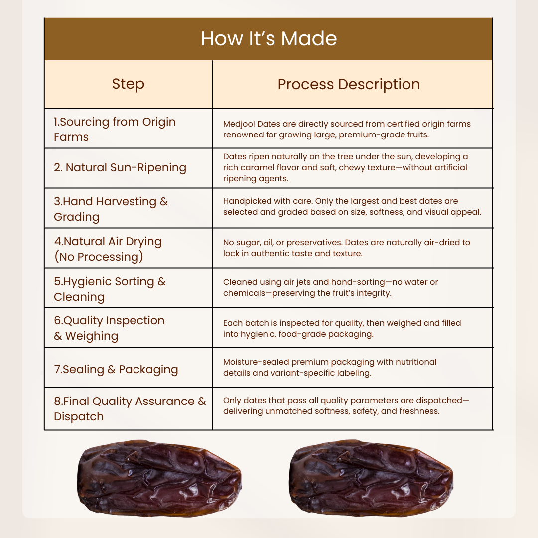 Our Jumbo Dates are handpicked at peak ripeness, sun-dried naturally, and packed without artificial processing or polishing — just nature’s best, carefully handled.